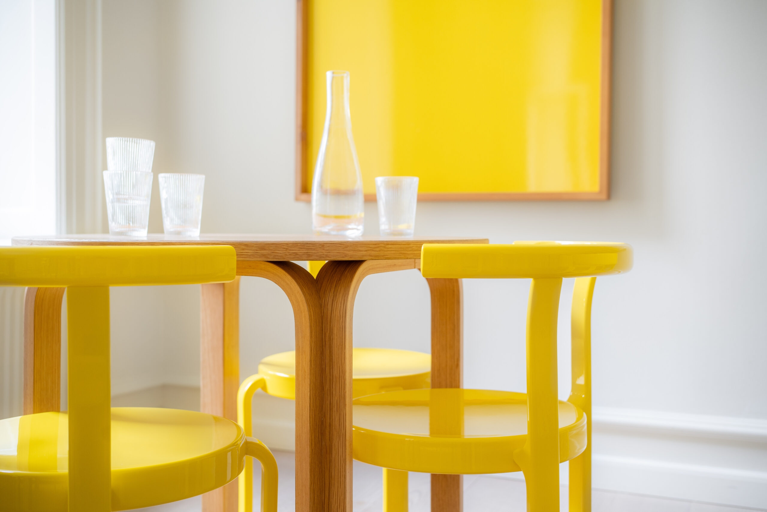 Model Slender is een praktisch maar eenvoudig ontwerp met een slanke uitstraling. De poten en het tafelblad zijn in een vloeiende lijn met elkaar verbonden waardoor het lijkt alsof de tafel uit één geheel bestaat. Doordat de poten op de uiterste hoeken onder het blad zijn geplaatst en de hoeken van het blad zijn afgerond, wordt de lichte constructie extra benadrukt.
