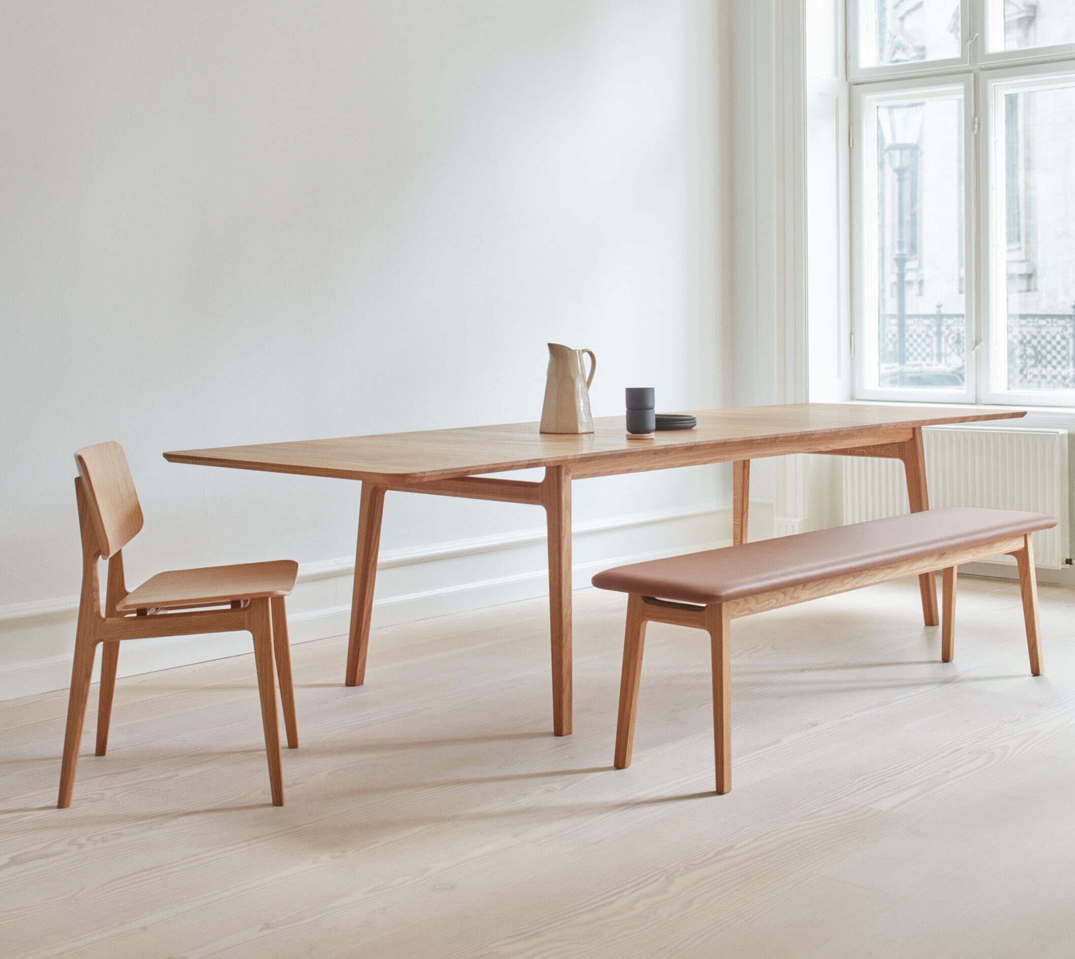 Model Slender is een praktisch maar eenvoudig ontwerp met een slanke uitstraling. De poten en het tafelblad zijn in een vloeiende lijn met elkaar verbonden waardoor het lijkt alsof de tafel uit één geheel bestaat. Doordat de poten op de uiterste hoeken onder het blad zijn geplaatst en de hoeken van het blad zijn afgerond, wordt de lichte constructie extra benadrukt.